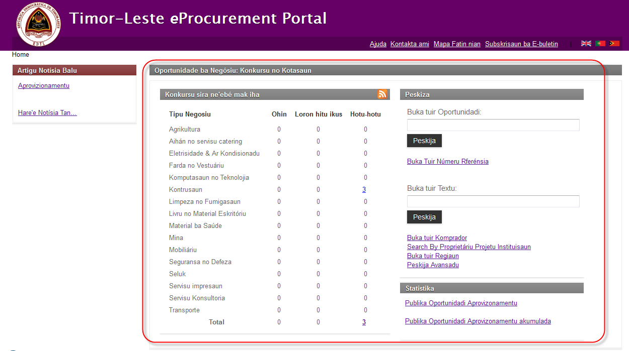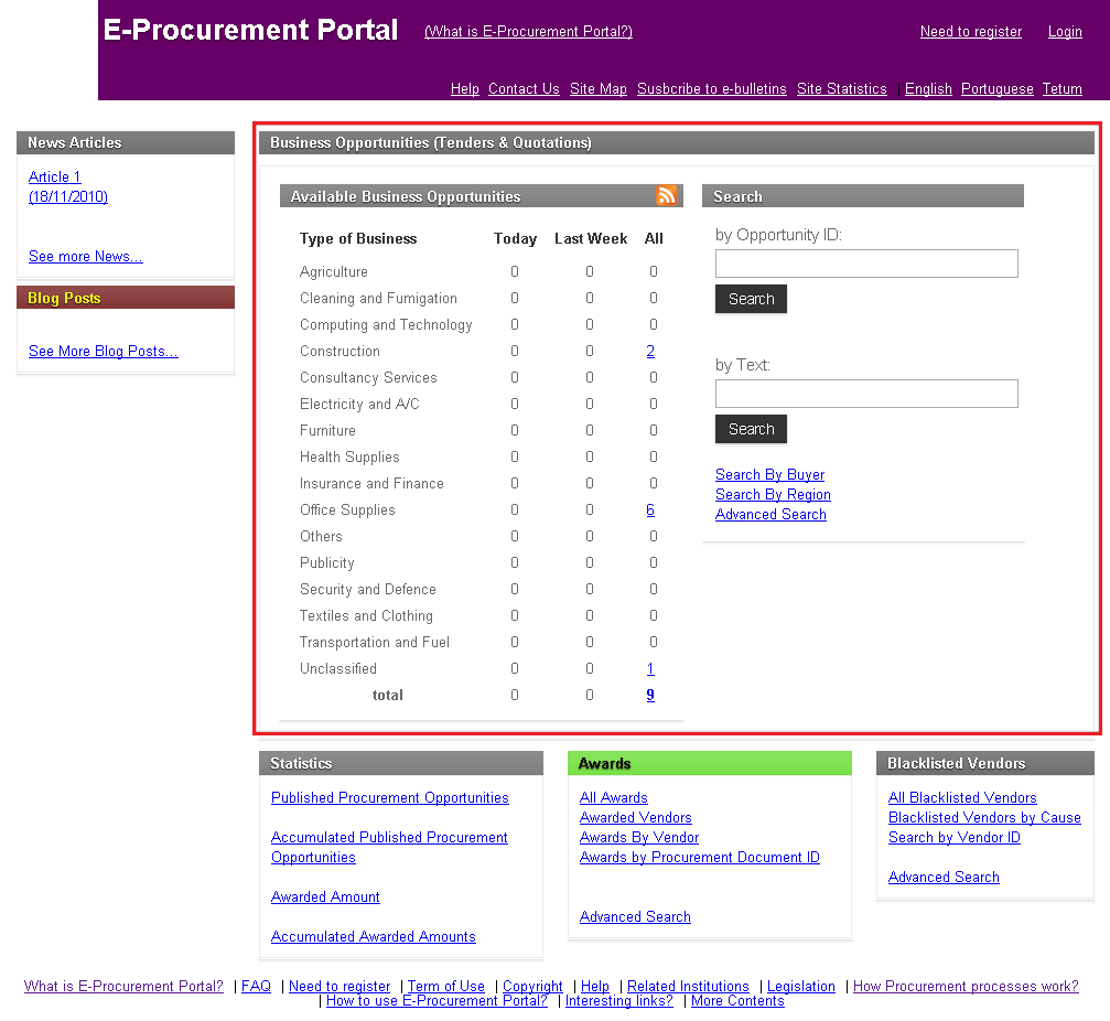 The eProcurement Portal allows citizens to view current government procurement demands. The Business Opportunities section presents a summarized list of current Procurement Bid Opportunities. The Available Business Opportunities section is organized by Type of Business. The User may view a list of opportunities and the surrounding details.