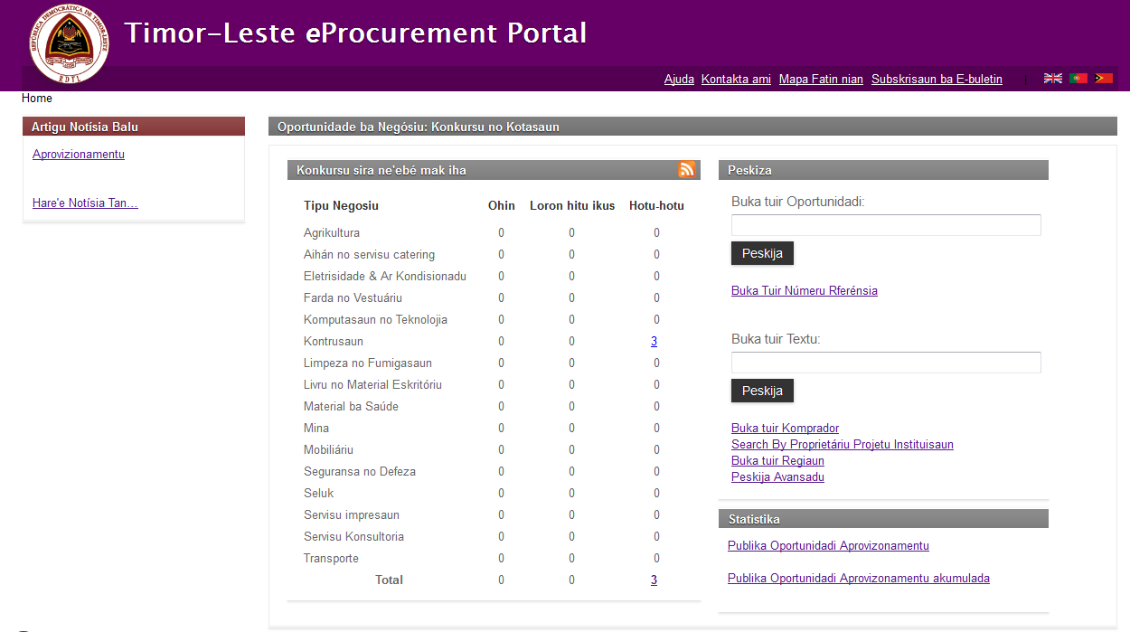 The eProcurement Portal allows citizens to view current government procurement demands. The Business Opportunities section presents a summarized list of current Procurement Bid Opportunities. The Available Business Opportunities section is organized by Type of Business. The User may view a list of opportunities and the surrounding details.